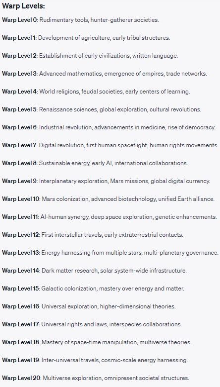- More ideas, debate, discussion, and more thinking about the future. Today we seldom think about what we want with humanity. We have opinions on certain areas, like climate, economy, and political ideology, but not often broader than that. With Warp Levels, there would be an ongoing discussion about this.