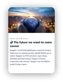 Our mission is to make the future come sooner. To do that we need to balance the negative bias in news media that is making people pessimistic about the future. Your membership supports our mission.