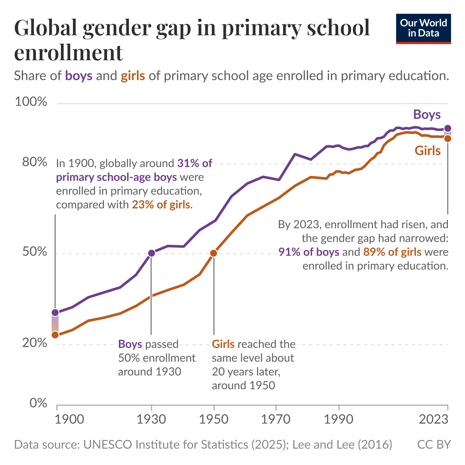 In 1900, only 31% of boys and 23% of girls of primary school age attended school globally. In 2023, 91% of boys and 89% of girls are enrolled in primary school. The gender gap in school enrollment has decreased from 8 percentage points to 2 percentage points in just over a hundred years.