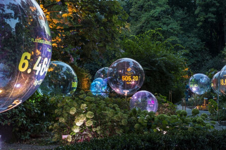 Optimist Daily writes βEach of the tree species featured in the garden is coupled with a floating sphere displaying how much CO2 the trees absorb. The installation expands over upwards of 500 square meters of garden, making it appear as though the air is full of gigantic bubbles.β