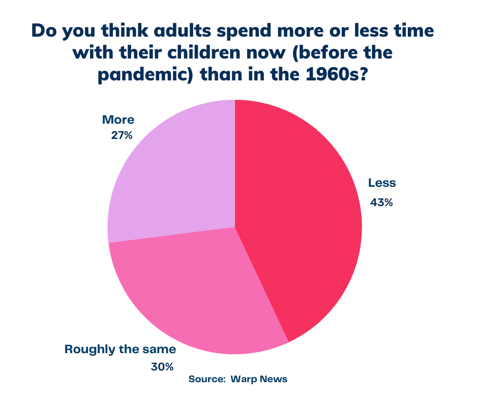 Most people, 43 percent, believe that we spend less time with our children now than in the 60s, according to our survey. 30 percent think that the time spent is about the same while 27 percent think we spend more time with the children now.