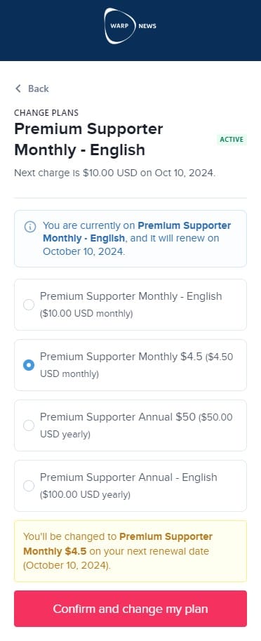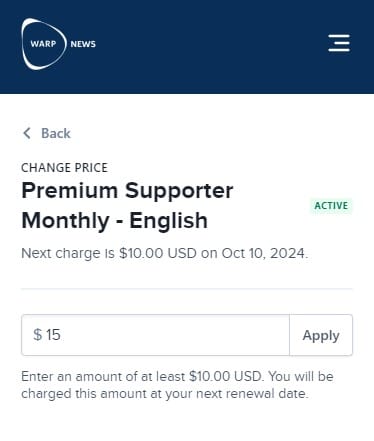 The two most common reasons for discontinuing being a Premium Supporter at Warp News are 1) not enough time to read and 2) too expensive. At the same time, there are members who want to pay more.